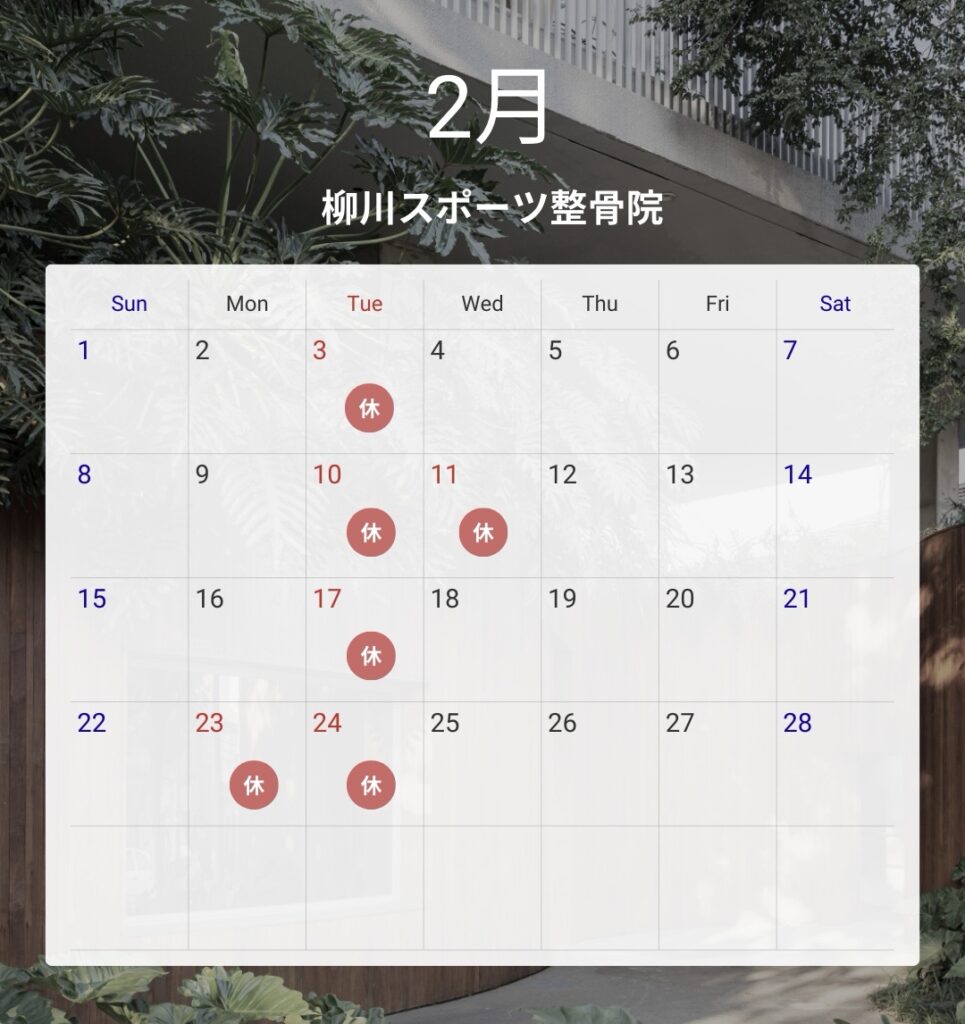 令和8年2月の診療案内🤟 投稿日 2026-02-08 著者 yanagawa.sports カテゴリー 今すぐ確認する 毎週(火)と11日、23日が休診となります👨⚕️ 柳川市柳川スポーツ整骨院寝違え、ギックリ腰、四十肩、五十肩捻挫、膝痛、肉離れ、打撲、骨折、脱臼EMS、水素、骨盤矯正、猫背矯正、産前産後交通事故、交通事故治療、自賠責超音波、マイクロカレント、ラジオ波温熱、ハイボルトオリジナルインソール、日曜診療、予約優先制 〒832-0806福岡県柳川市三橋町柳河581-1TEL 0944-69-9189